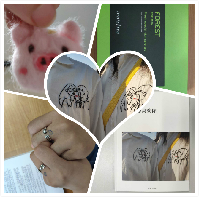 之后就是我们在一起后宝贝送我的礼物了。有好看又好吃的零食,记得宝贝说都舍不得给自己买的,给我买了,嘿嘿。有送给我的围巾手套手链袜子(本命年套装!),还是让室友给我准备的惊喜!我太喜欢了,但emmm就是在那之前我还跟宝贝闹脾气,对8起。宝贝还送了我情侣毛衣,和宝贝一起之后就有好多好多情侣的东西,真好。之后我还收到了宝贝给我戳的小猪,真的很可爱,这是在我们去 武汉(划掉,我竟然记错了,对8起,被宝贝看到我现在把它该过来)广州的火车上做的,宝贝说因为我把小狗弄丢了,所以正好在火车上有时间给我做一个(虽然挂的东西和小猪脱节了,好在没丢在外面,我一直放书包里)。然后宝贝在520的时候送给我了悦诗风吟的套装,真好啊520还能受到礼物,一直用到现在,真的不错。在100天的时候,我受到了宝贝给我的截止,这对我意义太大了,因为很早宝贝就和我说买了,我就一直想,我什么时候才够格拿到它,终于戴上了,我很开心(虽然宝贝不小心弄丢了寄几的那个,但是没关系,是时候我们再买一个了)。200天的时候,宝贝又给了我惊喜,女朋友牌衬衫,宝贝画了好几版,绣了好多遍,还扎了好多下手,我太感动了。最近提前收到宝贝给的七夕礼物,又是感动得直接流泪。